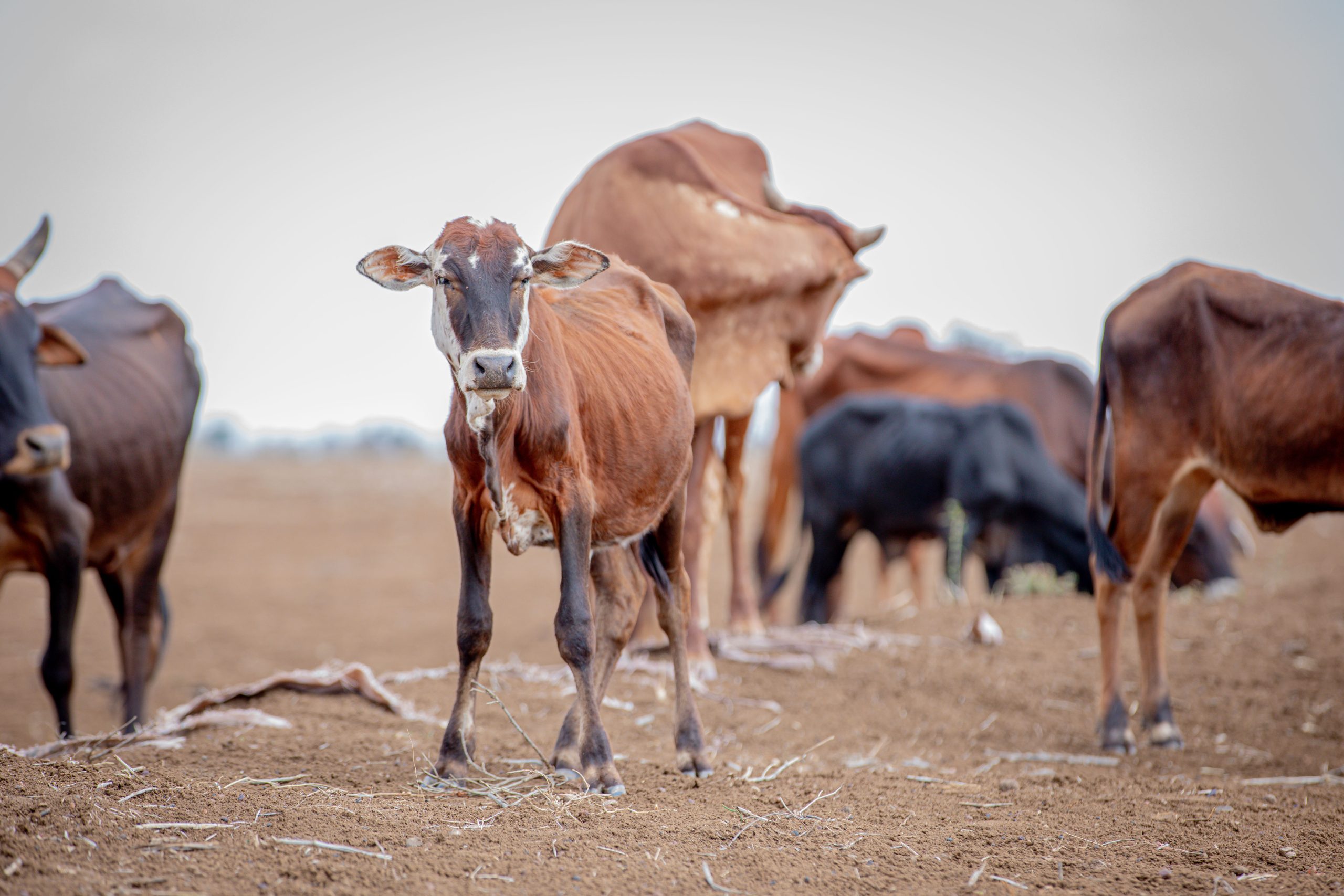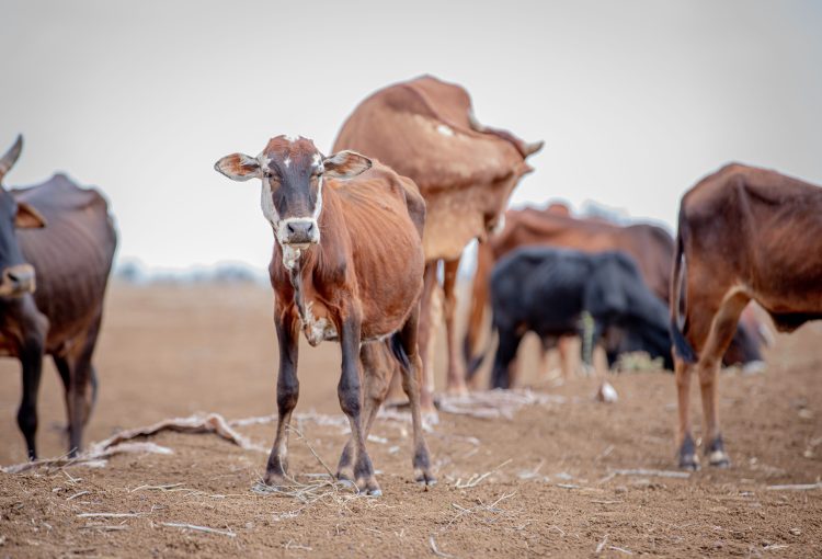 Cows severely weakened by the drought struggle to survive without adequate food or water.