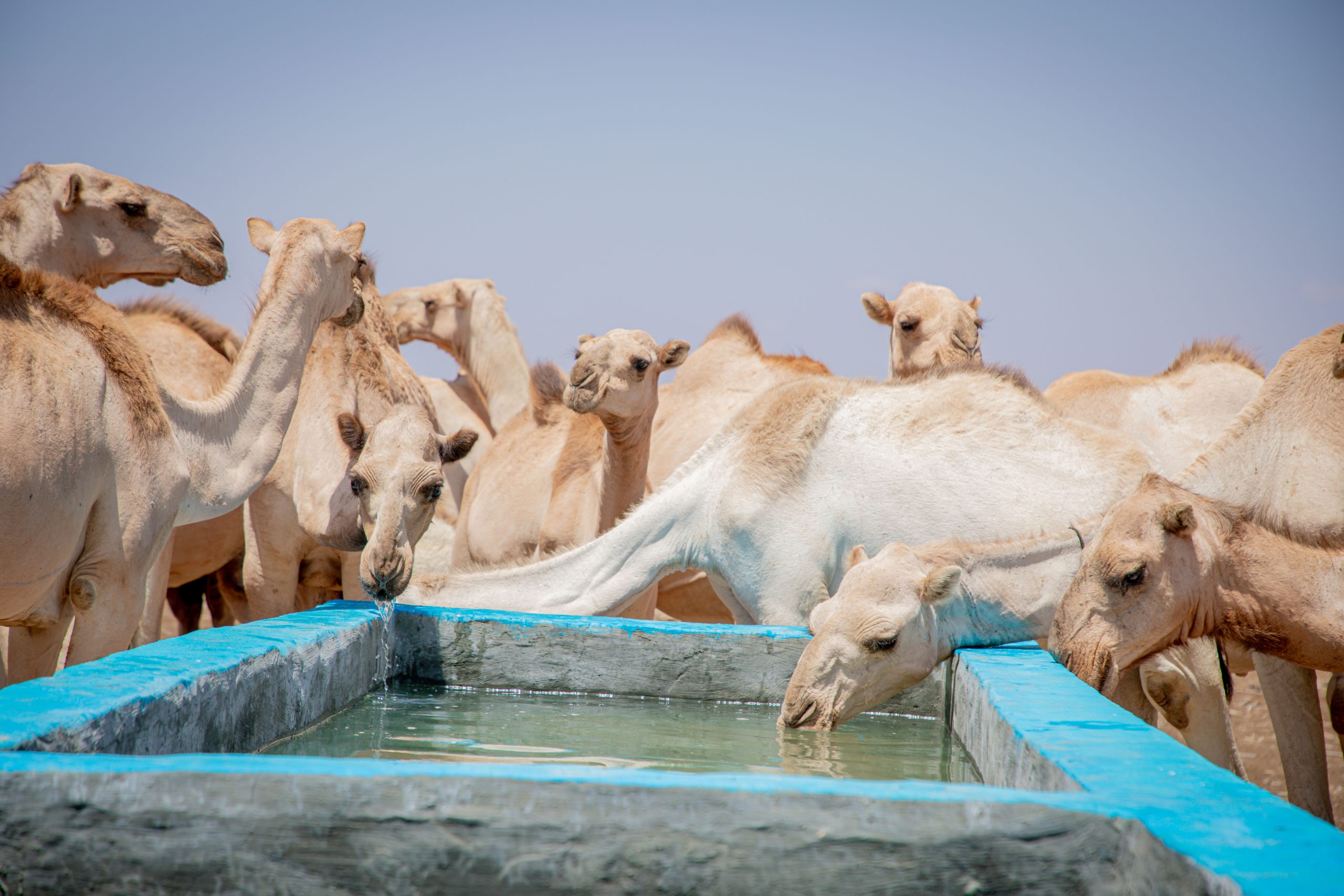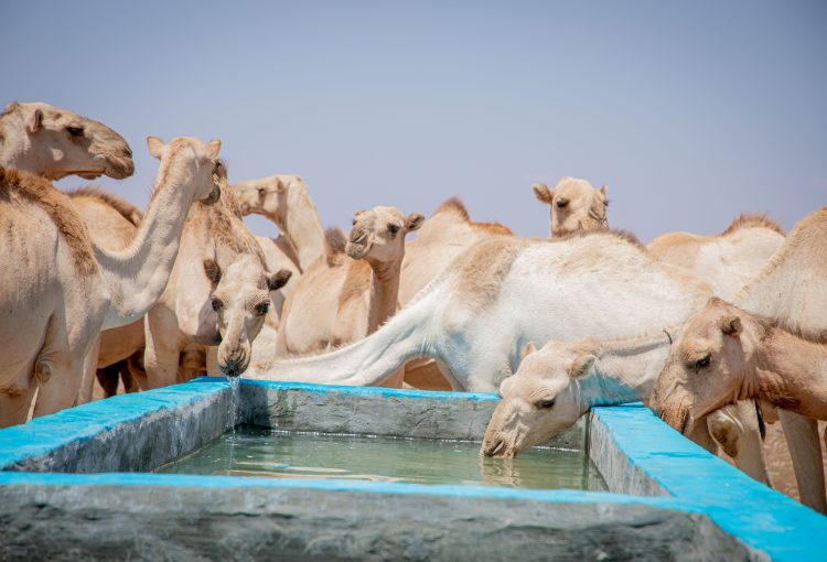 Camels drinking water from the trough at the newly constructed borehole.
