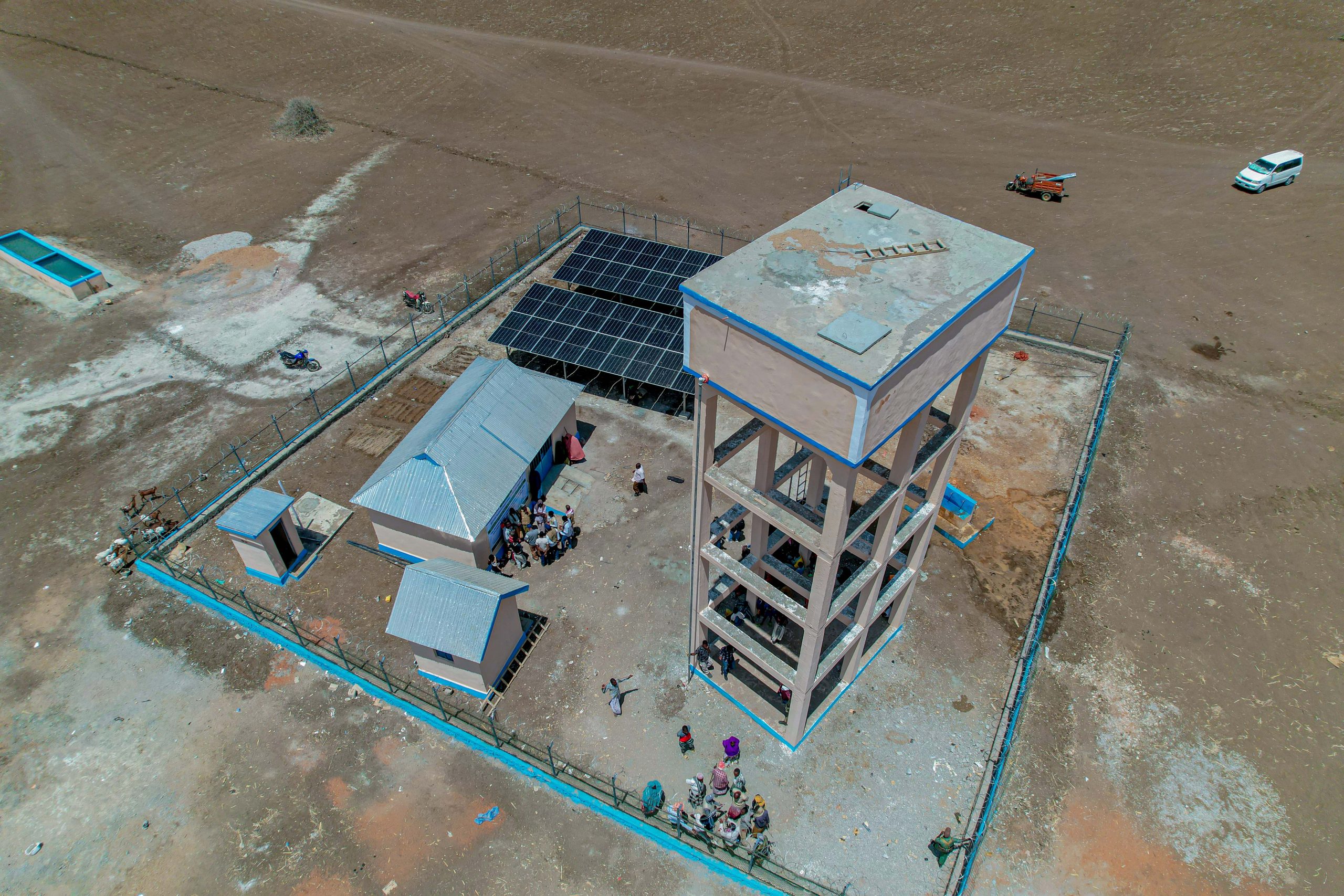 The borehole includes a solar power system, elevated water tank, piping networks, water kiosks, animal troughs, generator and operator room, fencing, and sanitation facilities. Constructed to improve access to safe and clean water, the system also helps reduce the risk of water-borne diseases. Communities that once travelled up to 15 kilometers in search of water can now access it closer to home. Water kiosks located near households have significantly reduced the burden of carrying heavy jerrycans, particularly for women and children. Livestock keepers no longer travel long distances to water their animals, and neighboring villages now bring their livestock to Bulla Haawey for access to this reliable source.