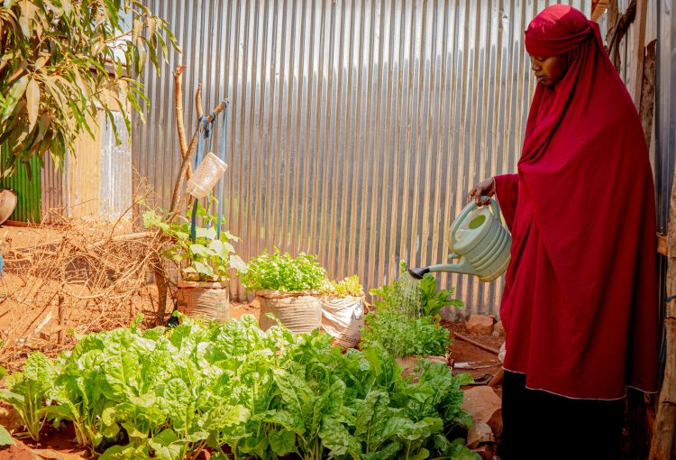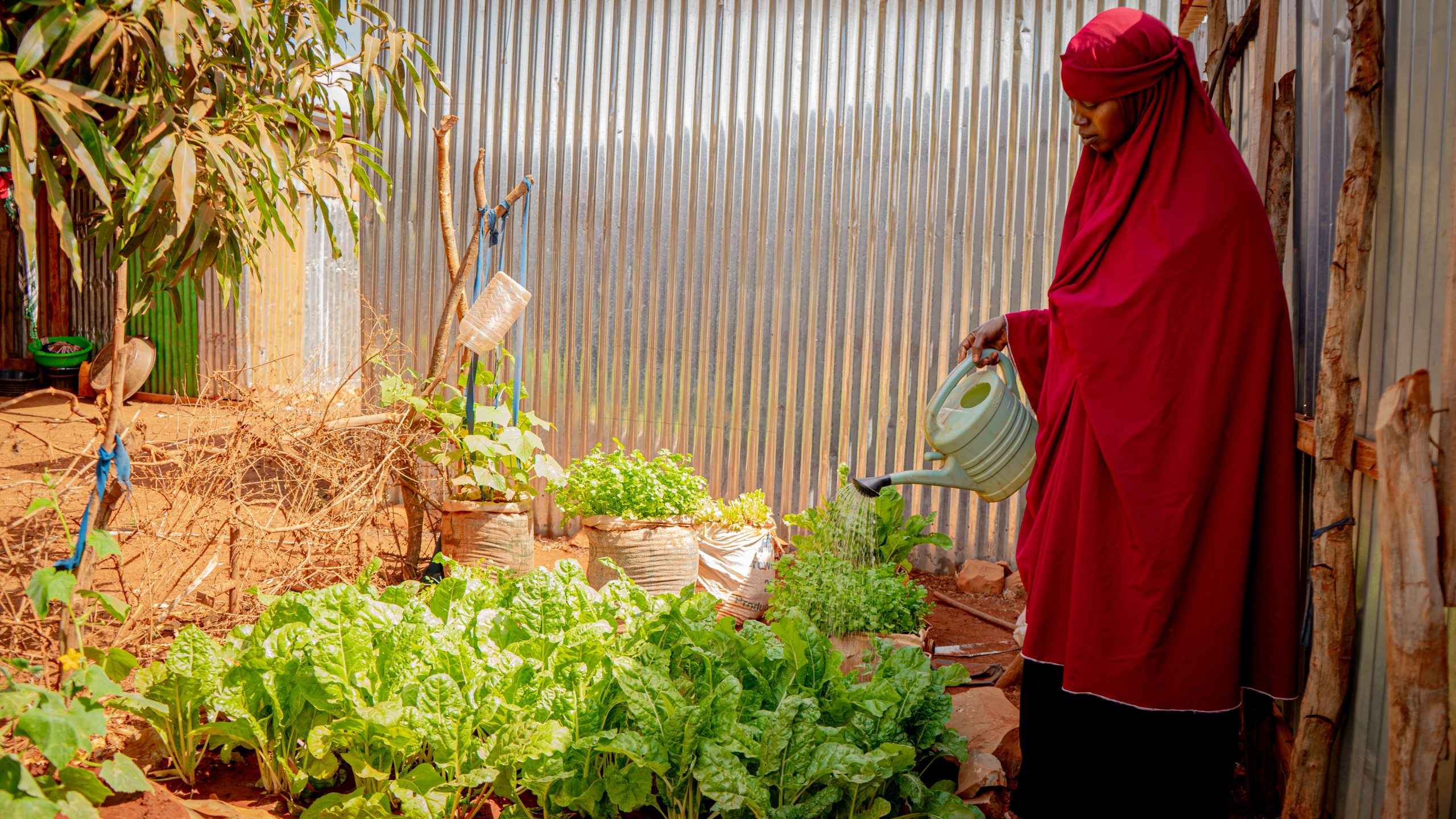 “Habiba watering her garden at home in Banbusul IDP camp, Baidoa,