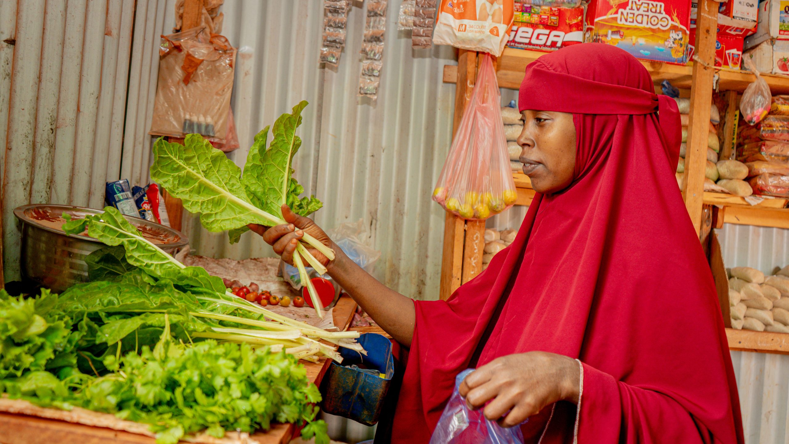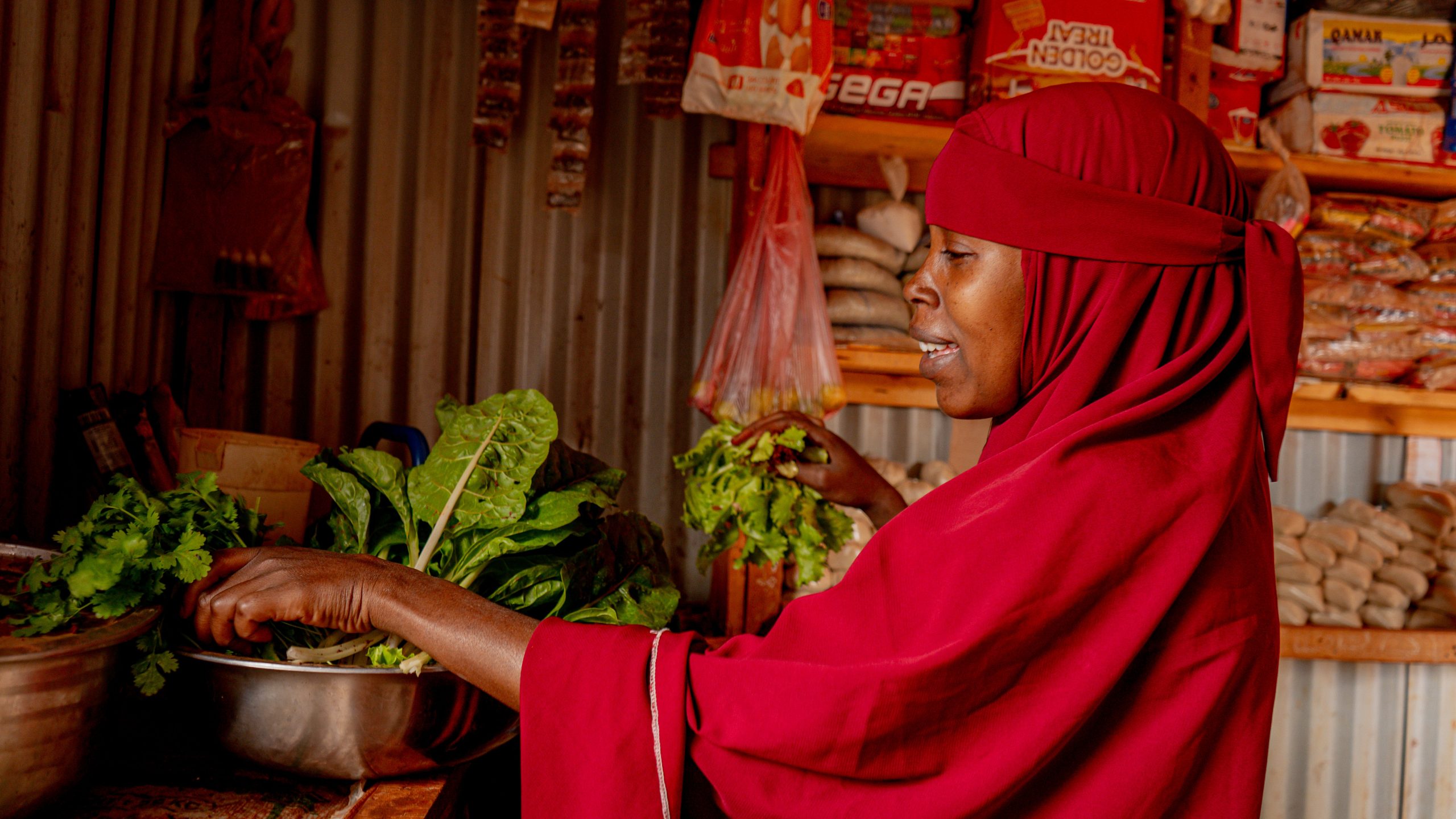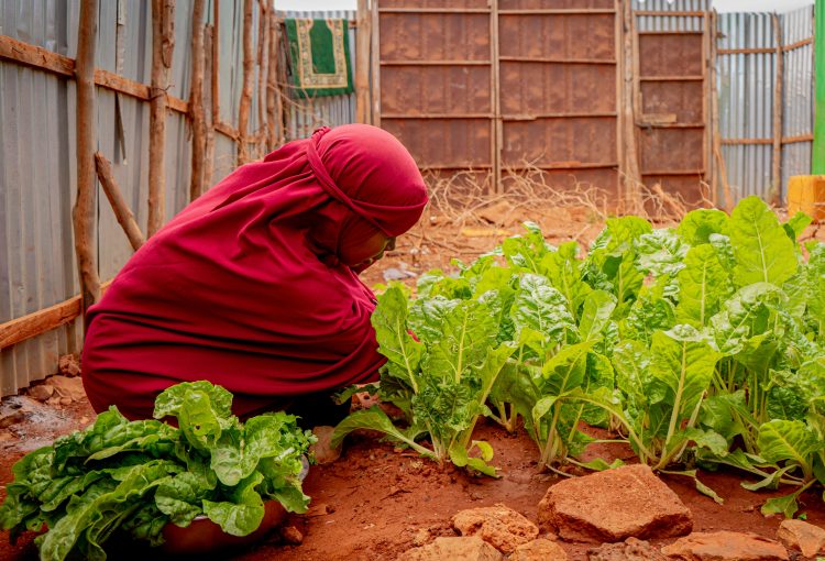 “Habiba in her home kitchen garden, cutting fresh vegetables for a meal.”